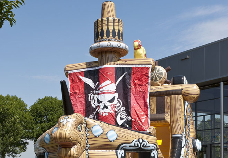 Przedstawiamy Państwu unikatową dmuchaną zjeżdżalnię o rozmiarach 12,0 x 4,4 x 6,7 m (DxSZxW), uszytą na podobieństwo ogromnego statku pirackiego. Całość atrakcji została udekorowana licznymi dmuchanymi elementami 3D, jak pirat, ster, czy papuga, a także pięknymi nadrukami odzwierciedlającymi drewniany statek piracki z groźnymi piratami rozwijającymi żagle i liny. Zarówno drabinka, jak i zjeżdżalnia są skierowane ku przodowi dmuchańca, a podstawa zjeżdżalni przechodzi w dmuchany zamek ogrodzony dziobem i burtami statku.